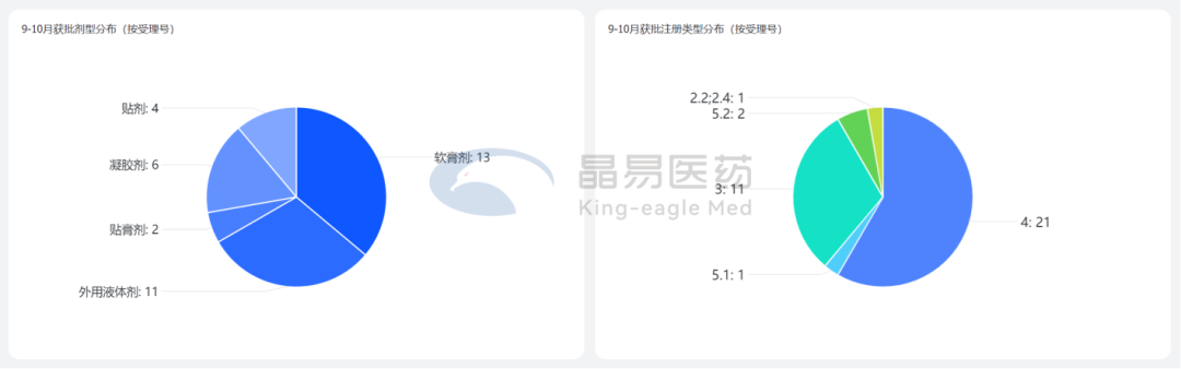 从剂型分布看,贴膏贴剂申报数量逐步增多,共13个受理号。包含1个中药1.1类新药,九典制药的椒七止痛凝胶贴膏;化药贴膏贴剂除洛索洛芬和氟比洛芬2个热门品种外,增加了利多卡因凝胶贴膏和格拉司琼透皮贴剂。