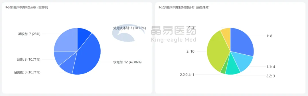 中药、化药均有1类和2类新药提交临床申请,中药新药品种数超过化药,包括小儿六味湿疹凝胶(1.1类)、玛木然其尼软膏(1.1类)、连冰喷雾剂(1.1类)、ZHY-211贴膏(1.1类)、TQA凝胶贴膏(2.2类)。