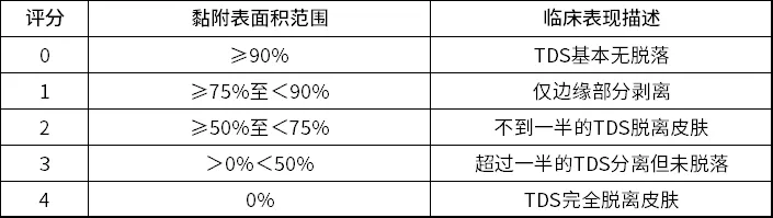 CDE推荐采用“皮肤反应”和“其他效应”评分量表进行皮肤刺激性反应评分,采用黏附性评分表进行黏附情况记录,评分量表见表1-表3。诱导期每次去除TDS后30min评价,激发期应在移除后30min、24h、48h和72h评估皮肤反应及是否致敏。
