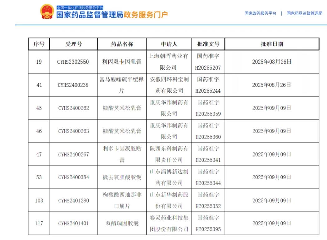 NMPA药品批准证明文件信息显示,上海朝晖药业有限公司的利丙双卡因乳膏、安徽四环科宝制药有限公司的富马酸喹硫平缓释片、重庆华邦制药有限公司的糠酸莫米松乳膏、陕西东科制药有限责任公司的利多卡因凝胶贴膏、山东淄博新达制药有限公司的熊去氧胆酸胶囊、山东新华制药股份有限公司的枸橼酸西地那非口崩片、赛灵药业科技集团股份有限公司的双醋瑞因胶囊及双醋瑞因原料药先后获批上市。其中,糠酸莫米松乳膏为全国第二家过评、利多卡因凝胶贴膏为全国第三家过评。