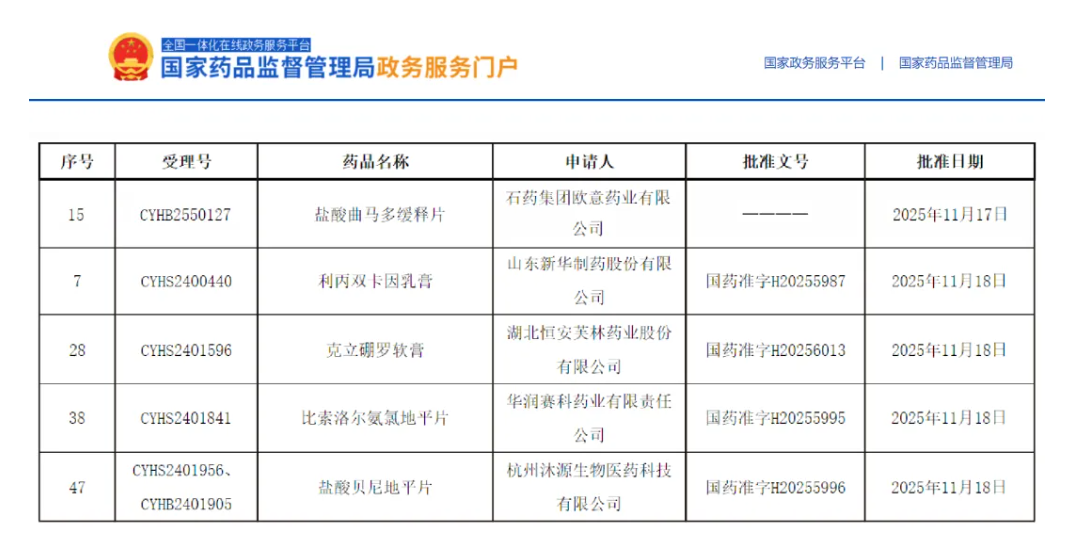 NMPA药品批准证明文件信息显示,石药集团欧意药业有限公司的盐酸曲马多缓释片、山东新华制药股份有限公司的利丙双卡因乳膏、湖北恒安芙林药业股份有限公司的克立硼罗软膏、华润赛科药业有限责任公司的比索洛尔氨氯地平片、杭州沐源生物医药科技有限公司的盐酸贝尼地平片先后获批上市。其中,盐酸曲马多缓释片为全国第二家过评。