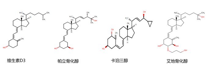 临床常用的维生素D及其结构类似物包括:维生素D2、维生素D3、骨化二醇、骨化三醇、阿法骨化醇、帕立骨化醇、卡泊三醇等。