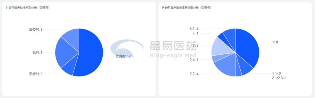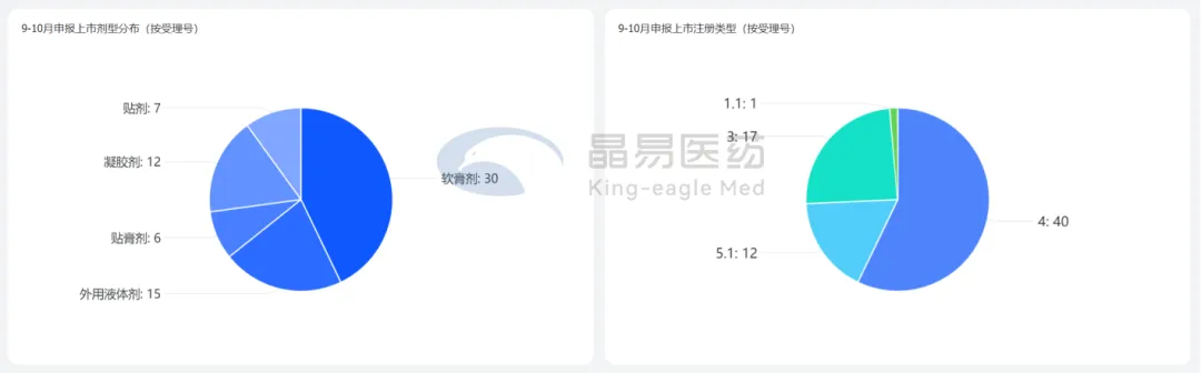 从剂型分布看,贴膏贴剂申报数量逐步增多,共13个受理号。包含1个中药1.1类新药,九典制药的椒七止痛凝胶贴膏;化药贴膏贴剂除洛索洛芬和氟比洛芬2个热门品种外,增加了利多卡因凝胶贴膏和格拉司琼透皮贴剂。