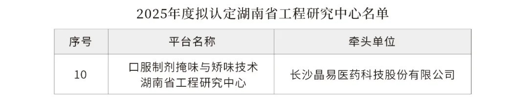 近日,湖南湘江新区发布《关于公示2025年度湖南省工程研究中心和企业技术中心拟认定名单的通知》,其中拟认定了10家工程研究中心,晶易医药“口服制剂掩味与矫味湖南省工程研究中心”成功上榜。
