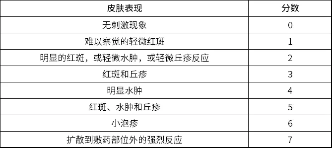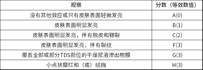 CDE推荐采用“皮肤反应”和“其他效应”评分量表进行皮肤刺激性反应评分,采用黏附性评分表进行黏附情况记录,评分量表见表1-表3。诱导期每次去除TDS后30min评价,激发期应在移除后30min、24h、48h和72h评估皮肤反应及是否致敏。