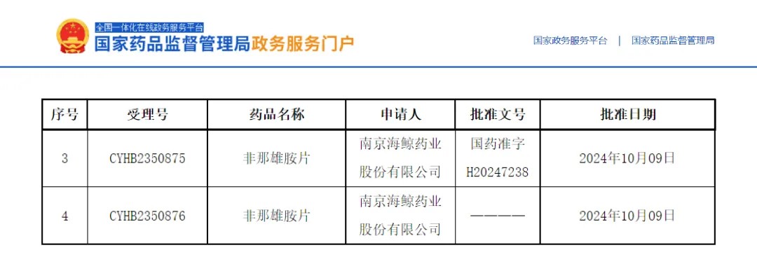 NMPA药品批准证明文件信息显示,江苏慧聚药业股份有限公司的非诺贝特酸胆碱缓释胶囊、湖南诺纳医药科技有限公司的右酮洛芬氨丁三醇片、成都赛璟生物医药科技有限公司..